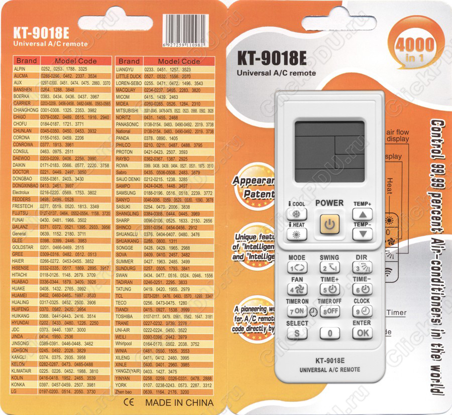 Универсальный пульт дистанционного управления QUNDA КТ-9018Е предназначен для управления более 4000 моделей кондиционеров различных производителей. Поддерживает все известные модели кондиционеров китайского производства, а также модели всемирно известных производителей.
