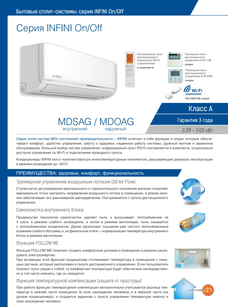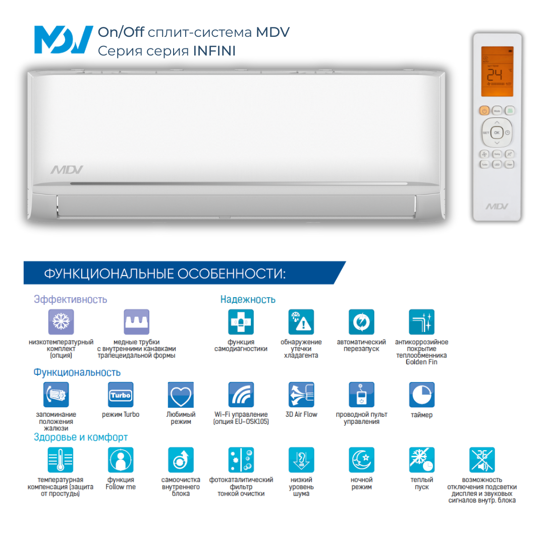 Серия сплит-систем MDV постоянной производительности INFINI On/Off сочетает в себе функции и опции, которые обеспечивают комфорт, удобство управления, заботу о здоровье, надежную работу системы, удобный монтаж и сервисное обслуживание.