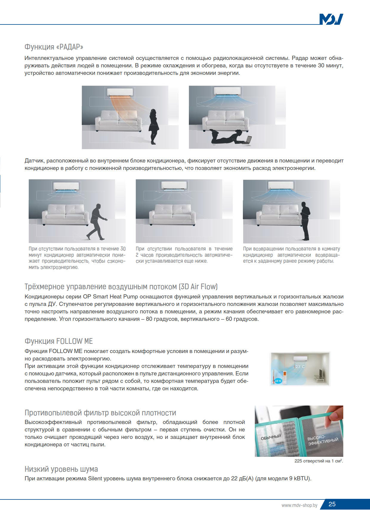✅ Минимальный уровень шума составляет всего 22 дБ(А), благодаря увеличенному размеру теплообменника внутреннего блока.